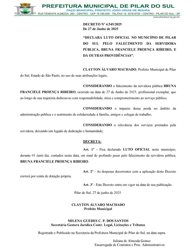 DECLARA LUTO OFICIAL NO MUNICÍPIO DE PILAR DO SUL PELO FALECIMENTO DA SERVIDORA PÚBLICA, BRUNA FRANCIELE PROENÇA RIBEIRO
