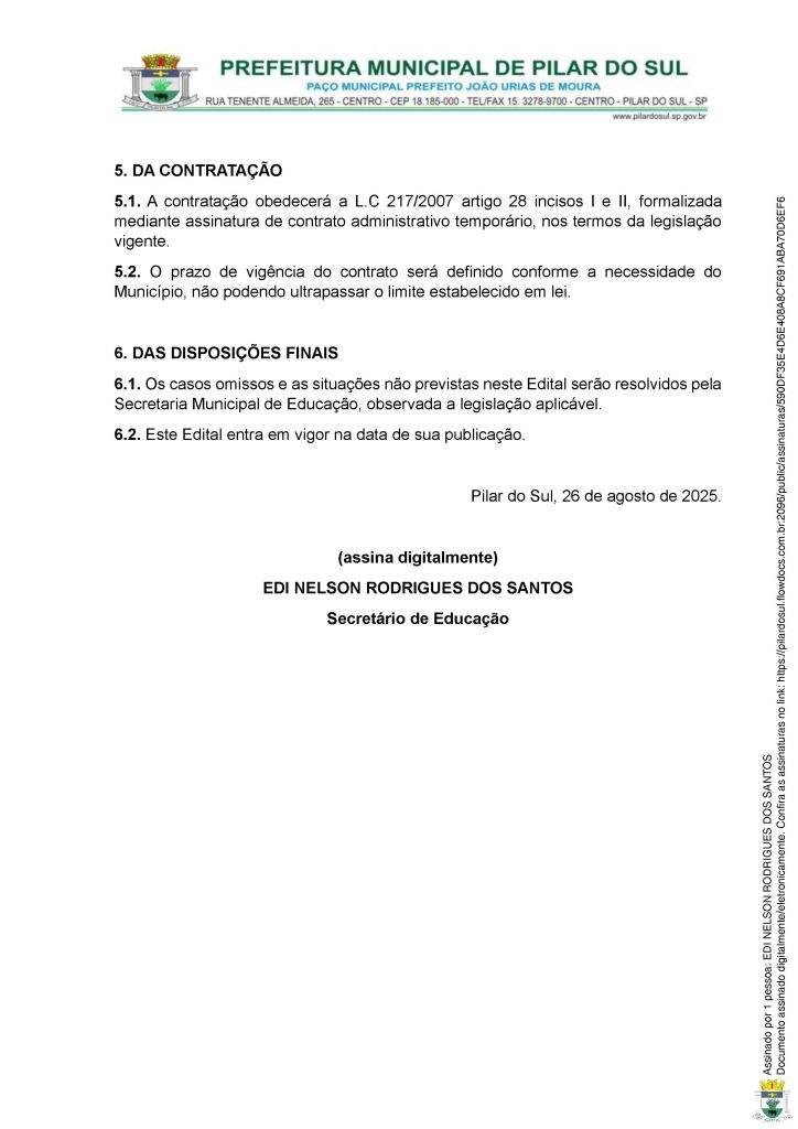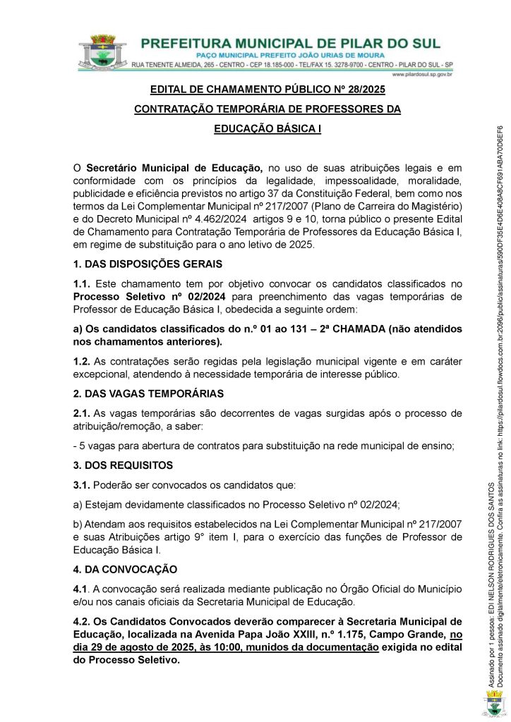 EDITAL DE CHAMAMENTO PÚBLICO Nº 28/2025 CONTRATAÇÃO TEMPORÁRIA DE PROFESSORES DA EDUCAÇÃO BÁSICA I