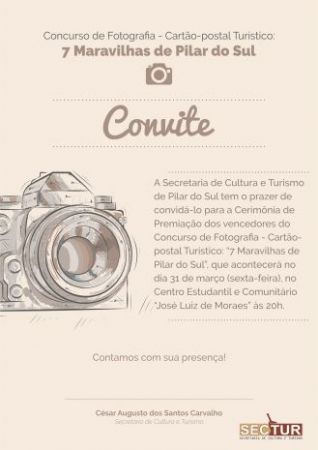 No dia 31 de maro, s 19h30, acontecer no Centro Estudantil e Comunitrio Jos Luiz de Moraes a Cerimnia de Premiao dos vencedores do Concurso Fotogrfico “Carto-Postal Turstico: 7 Maravilhas de Pilar do Sul”.