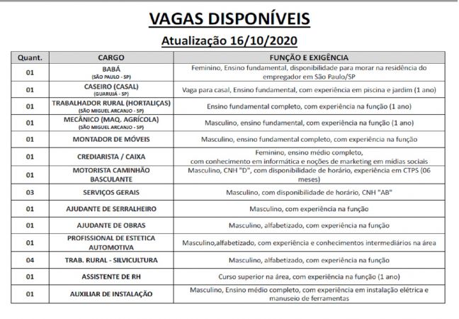 Vagas disponveis (16/10/2020) no PAT de Pilar do Sul