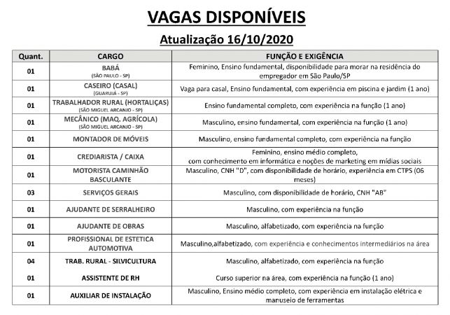 Vagas disponveis (16/10/2020) no PAT de Pilar do Sul           Fone: (15)3278 2084