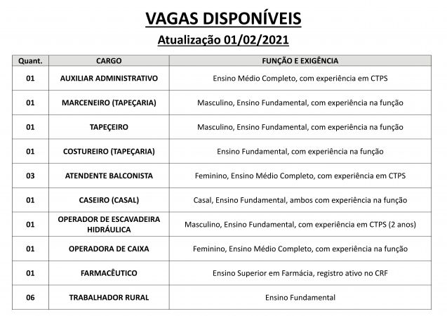 Vagas disponveis (01/02/2021) no PAT de Pilar do Sul