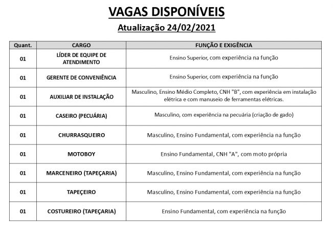 Vagas disponveis (24/02/2021) no PAT de Pilar do Sul