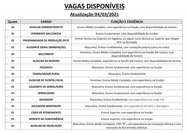 Vagas disponveis (04/03/2021) no PAT de Pilar do Sul