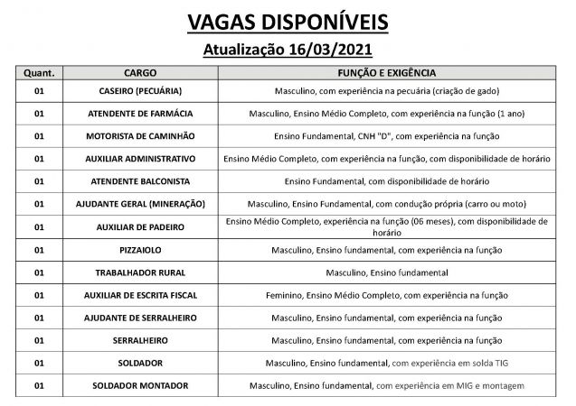 Vagas disponveis (16/03/2021) no PAT de Pilar do Sul