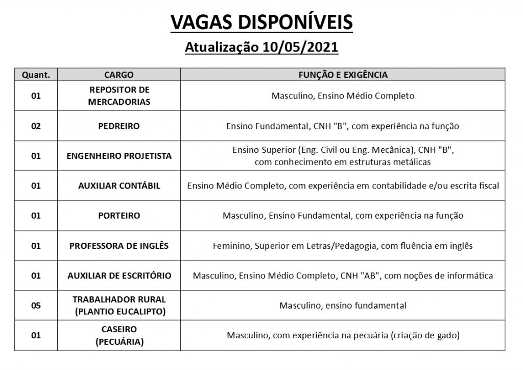 Vagas disponíveis (10/05/2021) no PAT de Pilar do Sul