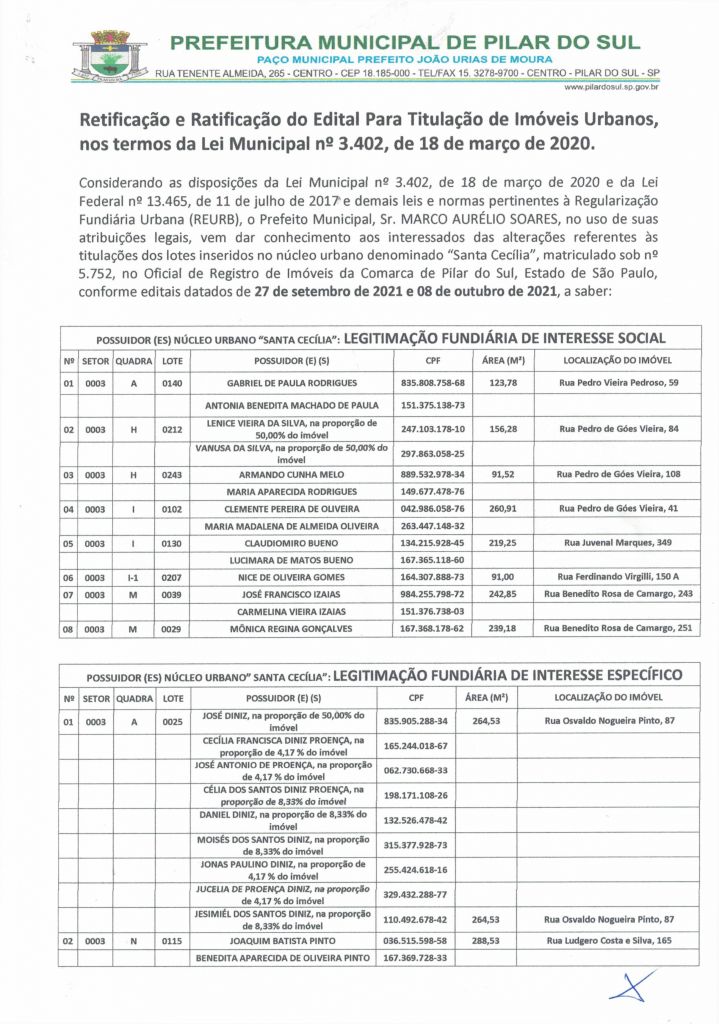 RETIFICAÇÃO E RATIFICAÇÃO DO EDITAL PARA TITULAÇÃO DE IMÓVEIS URBANOS DO NÚCLEO DENOMINADO "SANTA CECÍLIA"