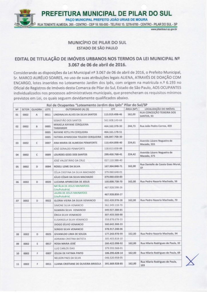 Nos termos da lei Municipal nº 3.067 de 06 de Abril de 2016