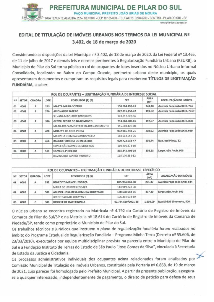 EDITAL DE TITULAÇÃO DE IMÓVEIS URBANOS