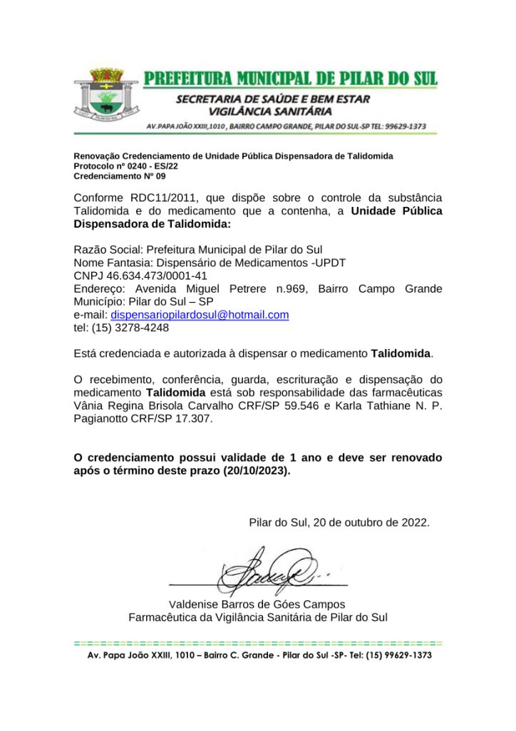 Renovação Credenciamento de Unidade Pública Dispensadora de Talidomida  09/2022