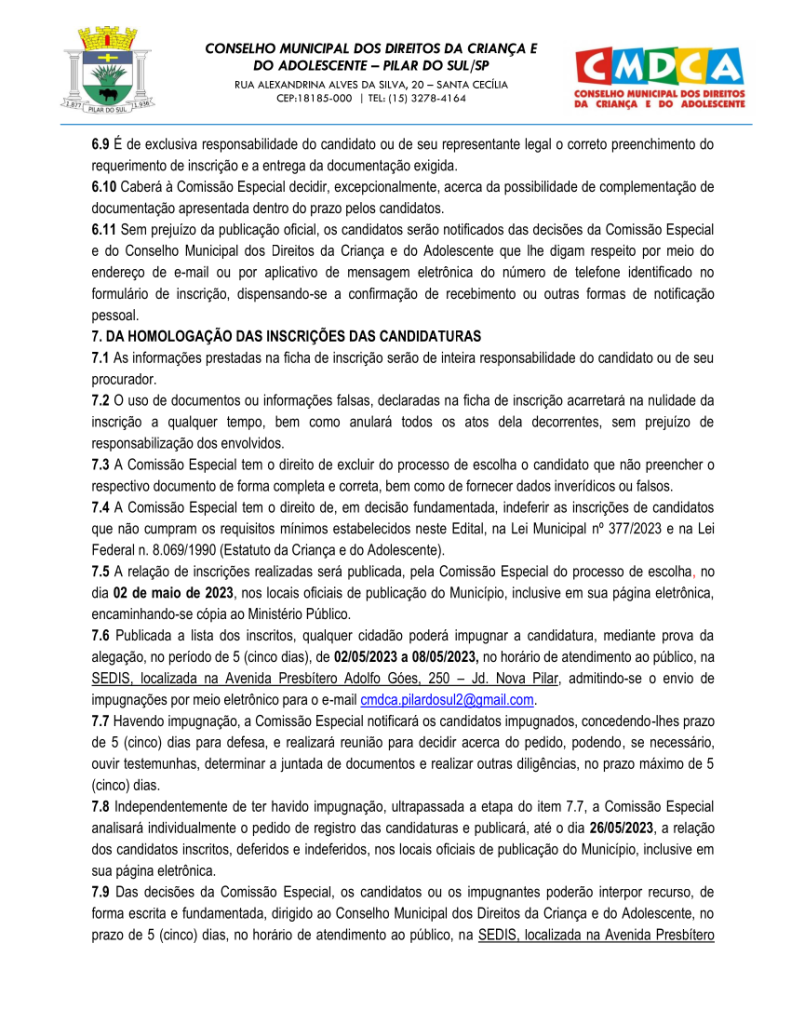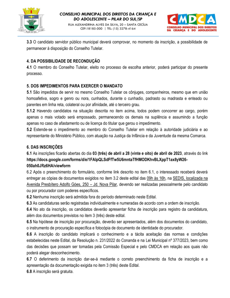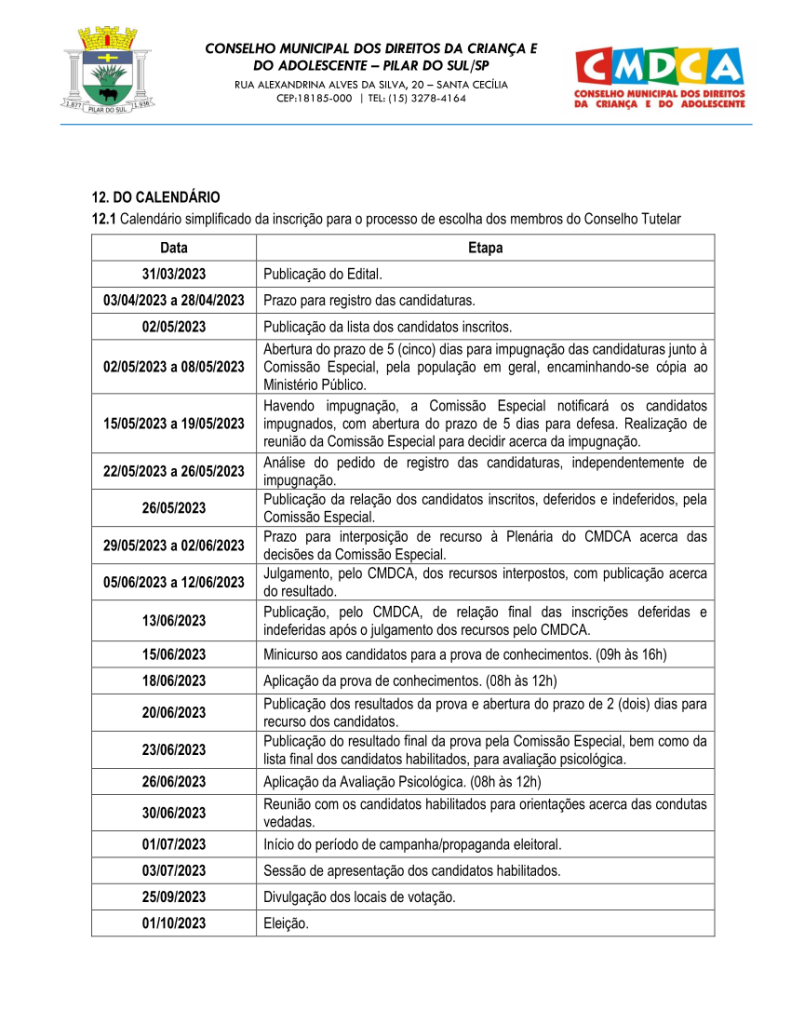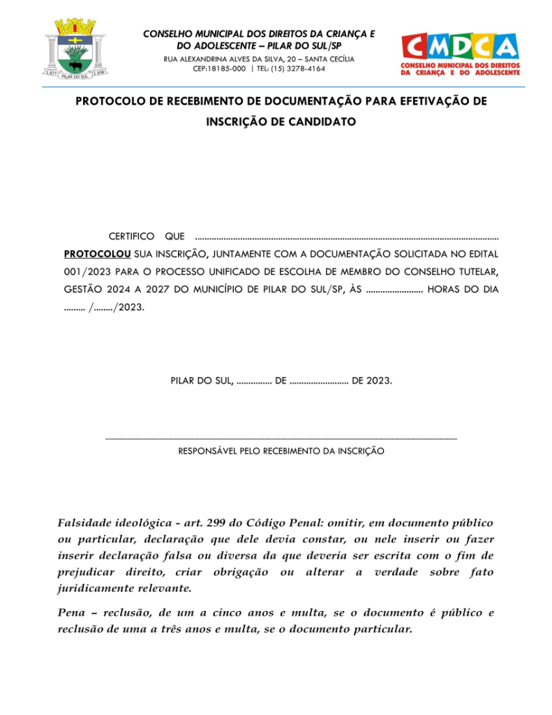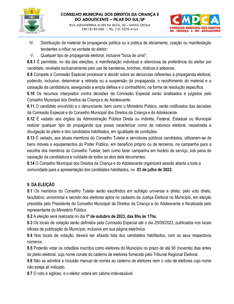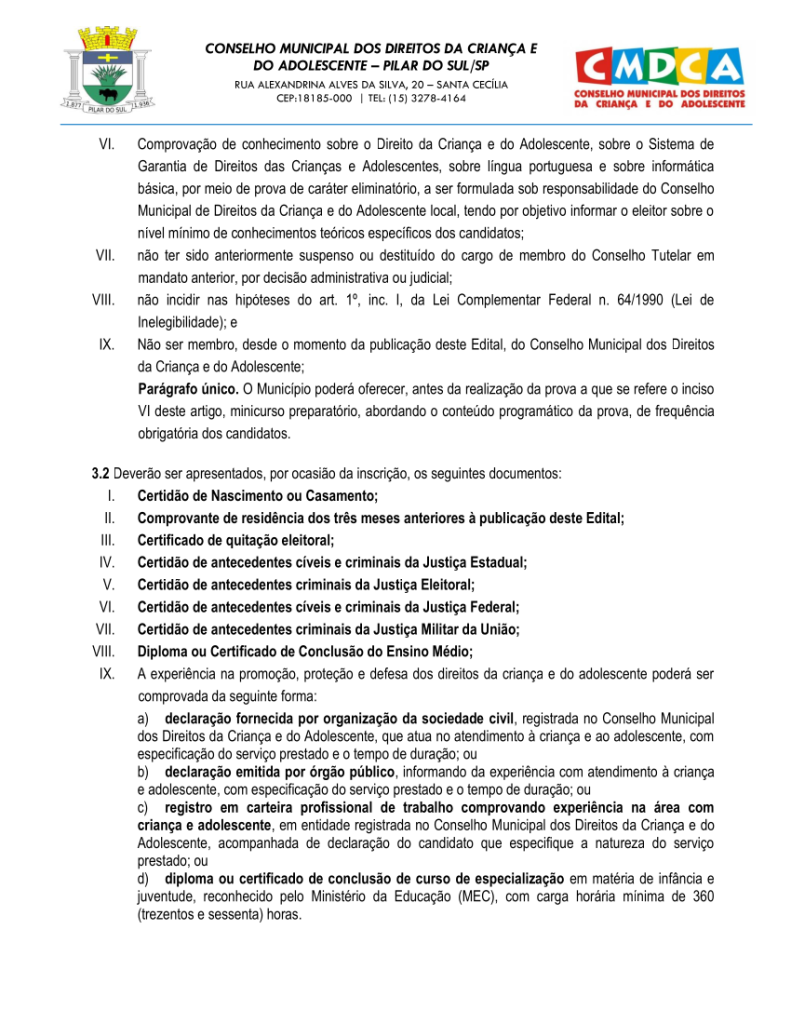 Inscrições para o Processo de Escolha dos Membros do Conselho Tutelar de Pilar do Sul/SP