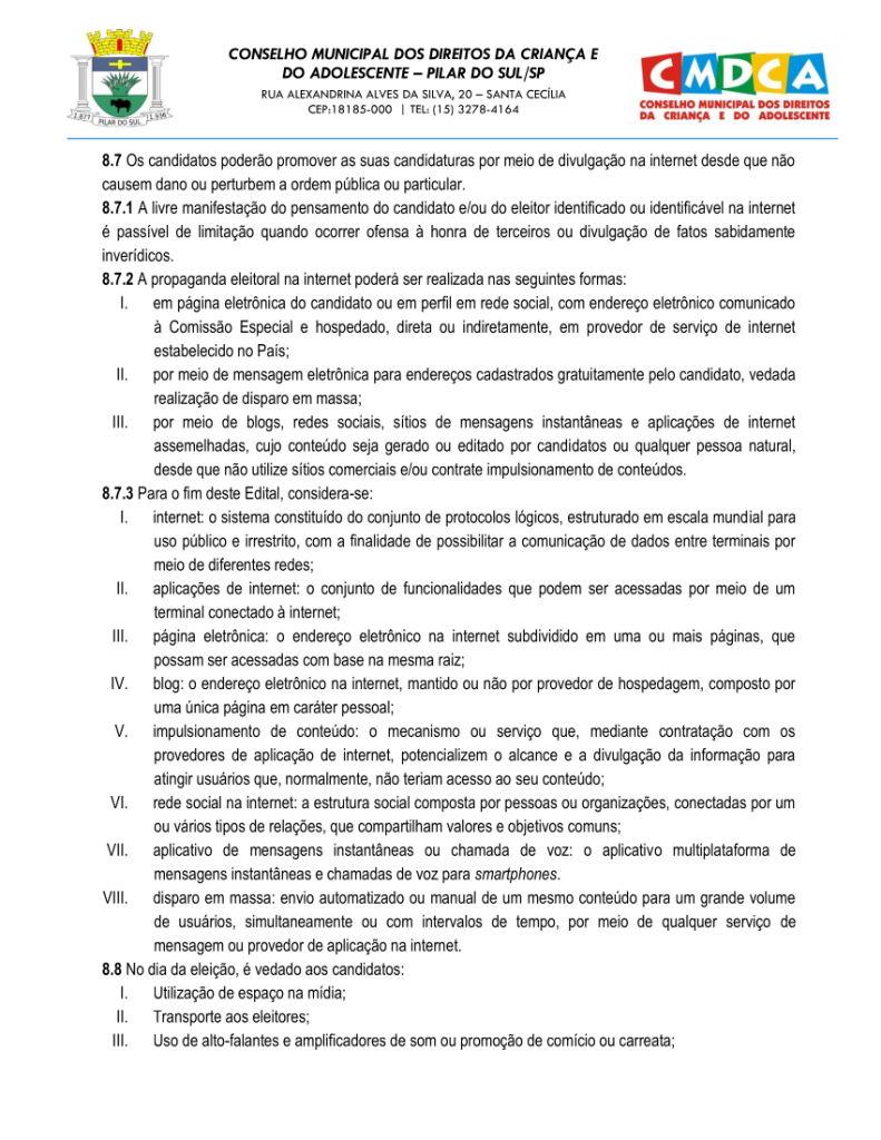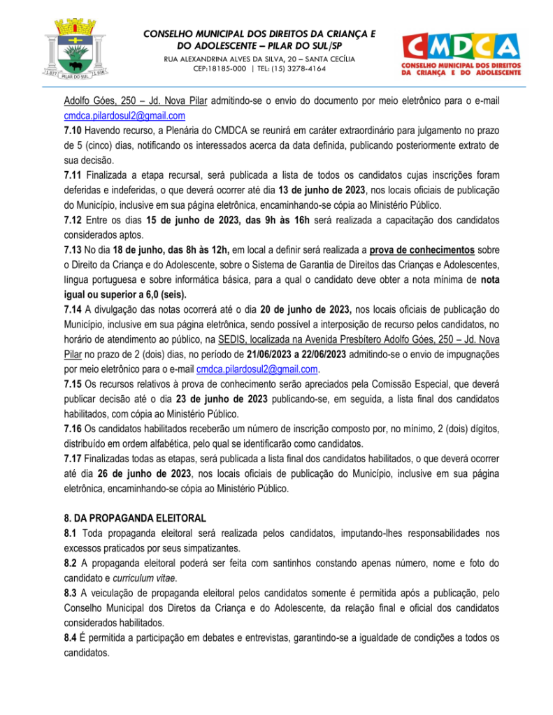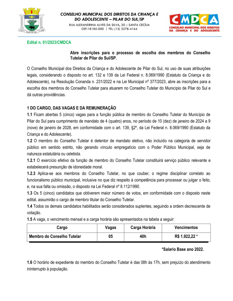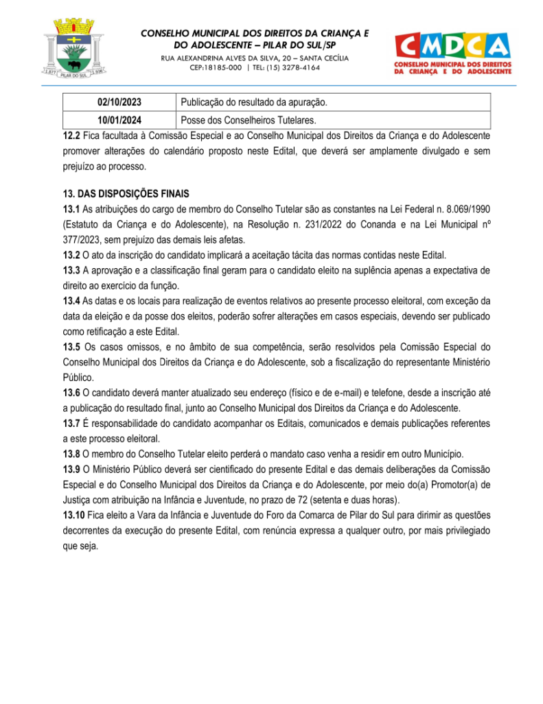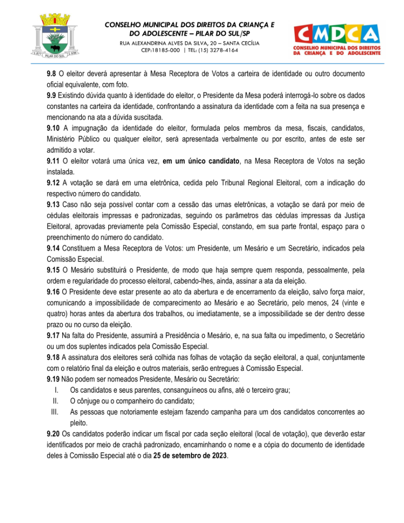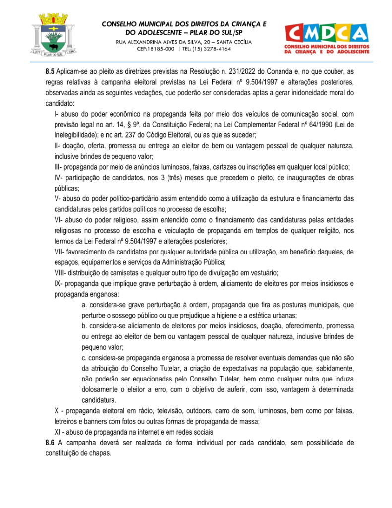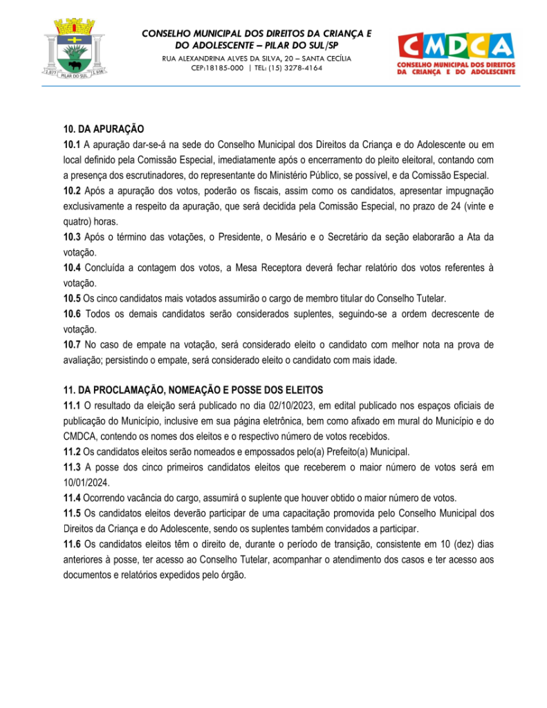 Inscrições para o Processo de Escolha dos Membros do Conselho Tutelar de Pilar do Sul/SP