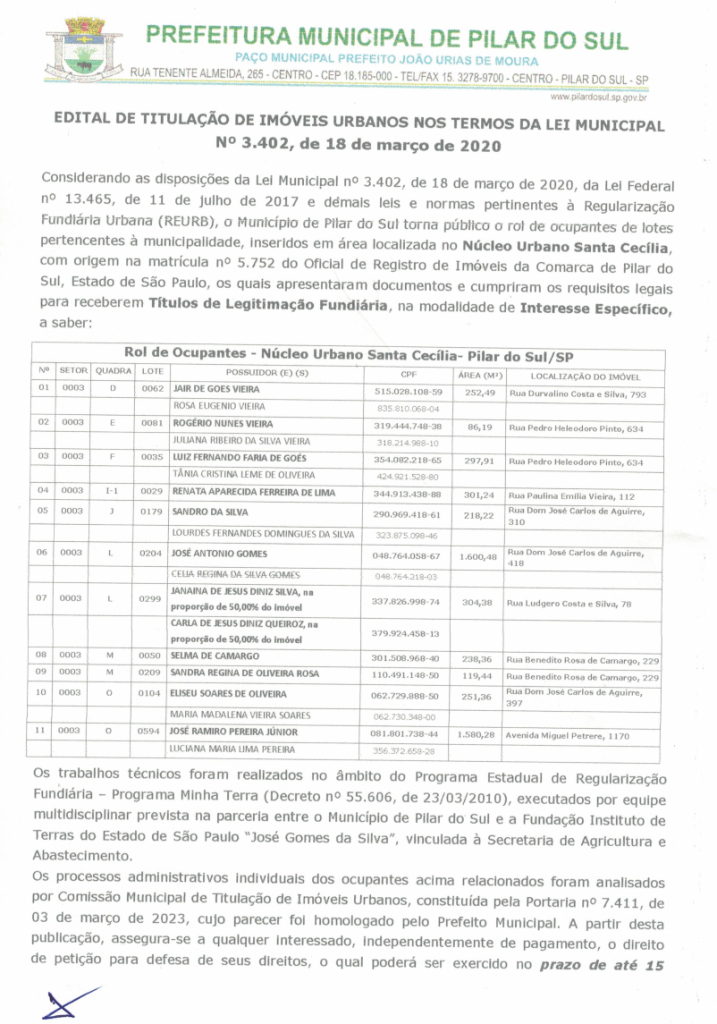 EDITAL DE TITULAÇÃO DE IMÓVEIS URBANOS