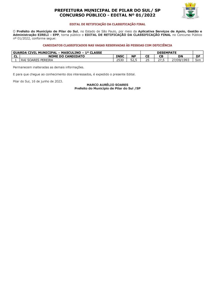 CONCURSO PÚBLICO Nº 01/2022 - (GCM) EDITAL DE RETIFICAÇÃO DA CLASSIFICAÇÃO FINAL