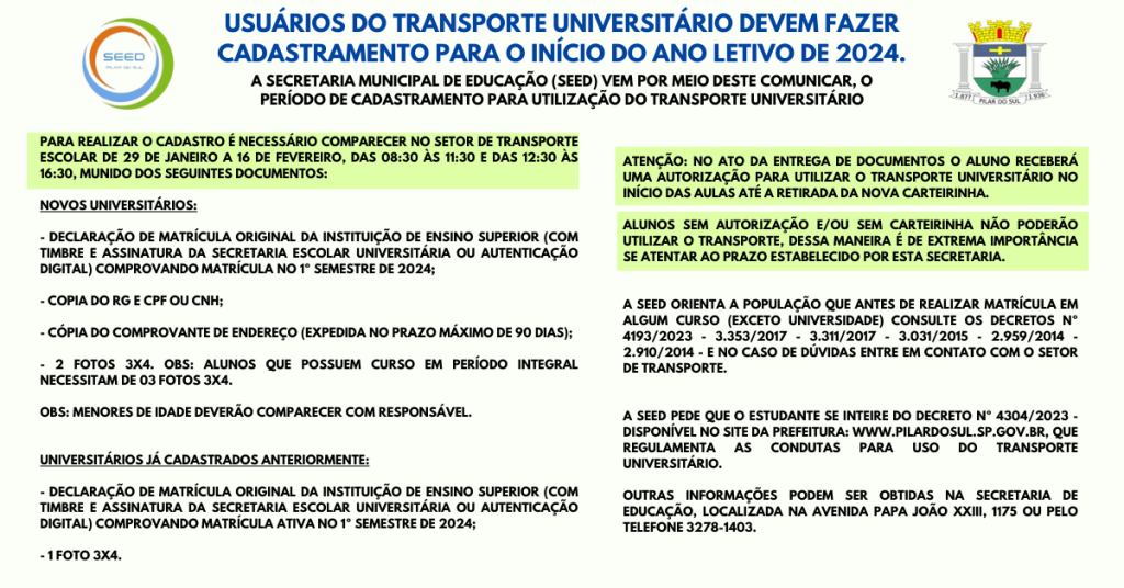 TRANSPORTE UNIVERSITÁRIO CADASTRAMENTO PARA O INÍCIO DO ANO LETIVO DE 2024