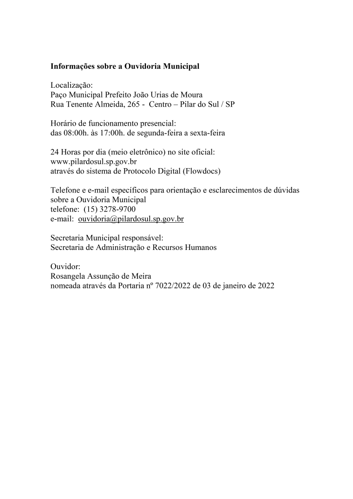 RELATÓRIO ANUAL DA OUVIDORIA MUNICIPAL DE PILAR DO SUL / SP