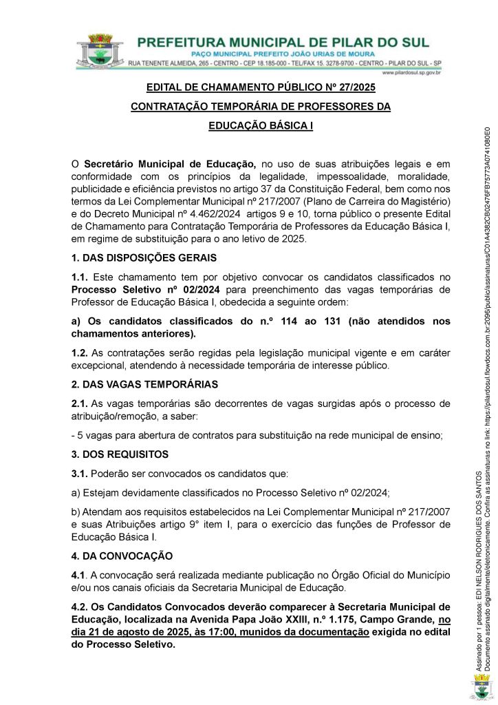 EDITAL DE CHAMAMENTO PÚBLICO Nº 27/2025 CONTRATAÇÃO TEMPORÁRIA DE PROFESSORES DA EDUCAÇÃO BÁSICA I