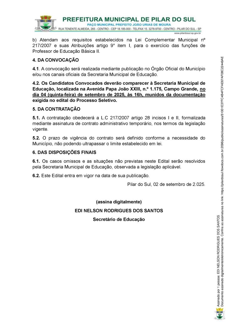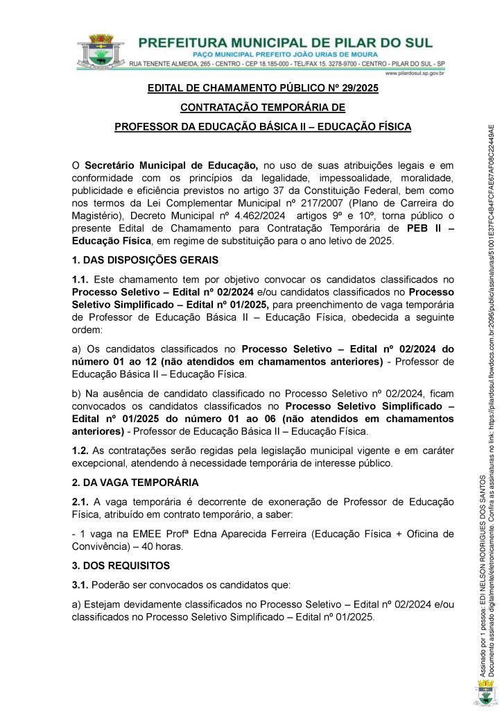 EDITAL DE CHAMAMENTO PÚBLICO Nº 29/2025 CONTRATAÇÃO TEMPORÁRIA DE PROFESSOR DA EDUCAÇÃO BÁSICA II – EDUCAÇÃO FÍSICA
