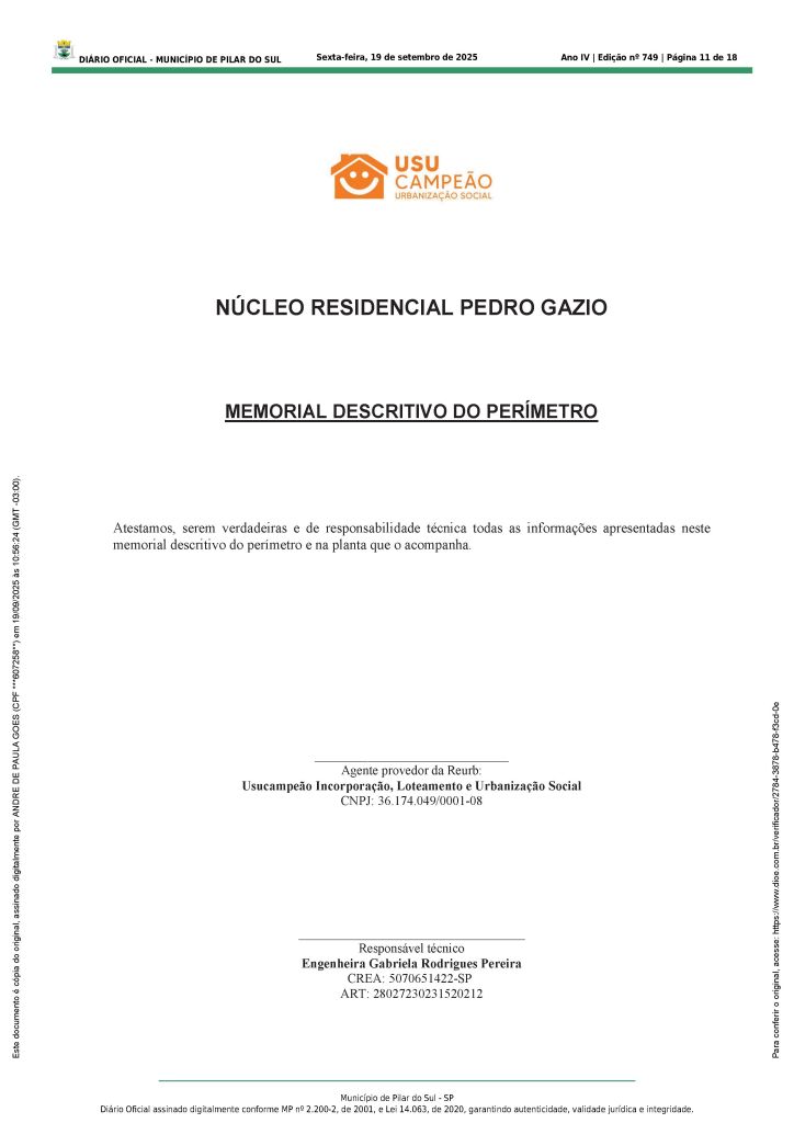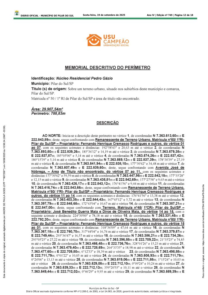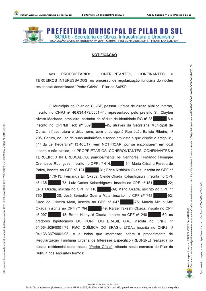 Notificação aos PROPRIETÁRIOS, CONFRONTANTES, CONFINANTES e TERCEIROS INTERESSADOS, no processo de regularização fundiária do núcleo residencial denominado “Pedro Gázio” – Pilar do Sul/SP