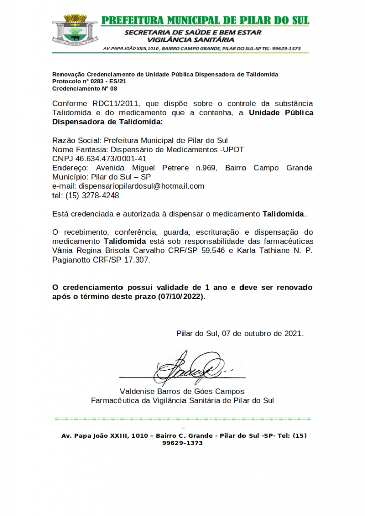 Renovação Credenciamento de Unidade Pública Dispensadora de Talidomida